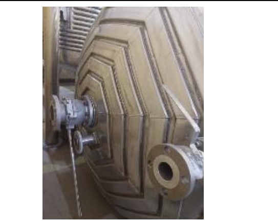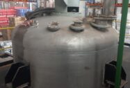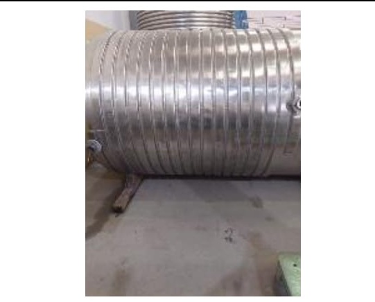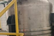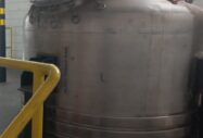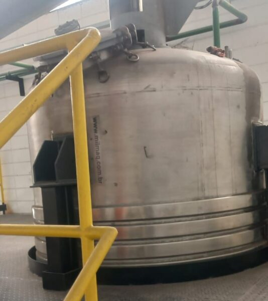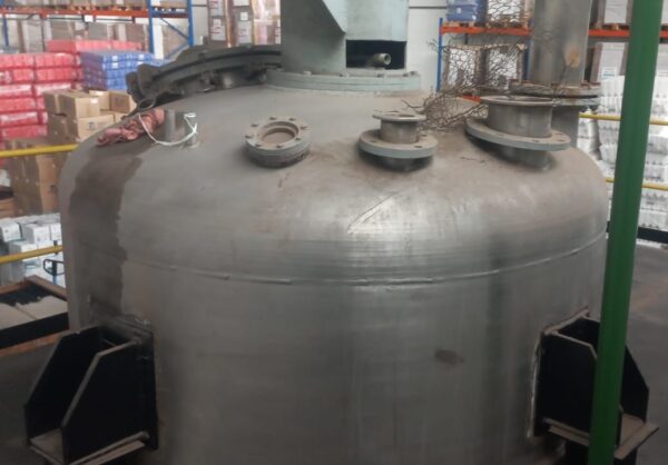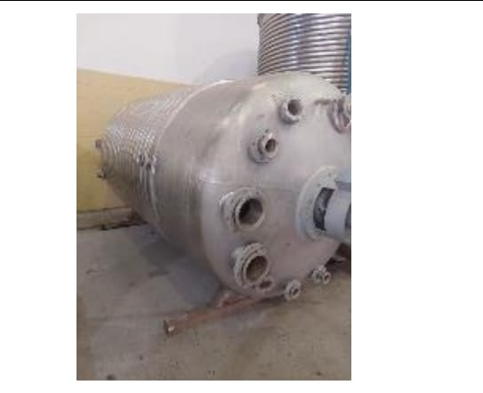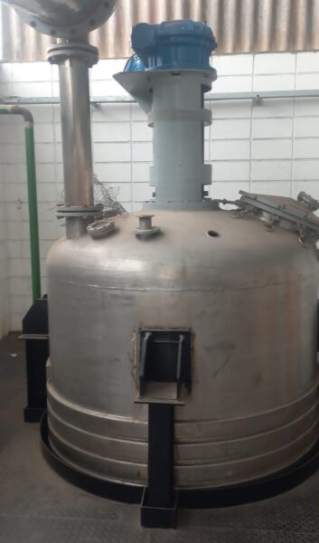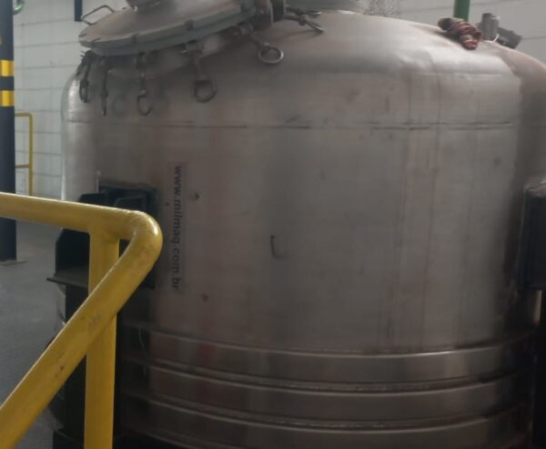 Reator industrial tipo vaso de pressão, vertical, em aço inoxidável AISI 316L com sistema de agitação interna (motor + redutor) e serpentinas no costado para controle térmico. Equipamento ideal para processos que exigem resistência química, agitação e controle de temperatura.